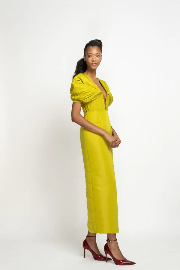A sleek sheath dress in chartreuse faille, designed with a fitted silhouette. The look is elevated with moulded sleeves that add sculptural structure to the otherwise clean lines. The luminous faille fabric enhances the bold color.