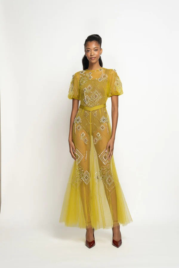 A chartreuse tulle dress detailed with Alpana embroidery across the bodice and skirt. The lightweight tulle fabric creates movement, while the embroidery adds texture and dimension. The silhouette is fitted at the top and flows softly through the skirt.