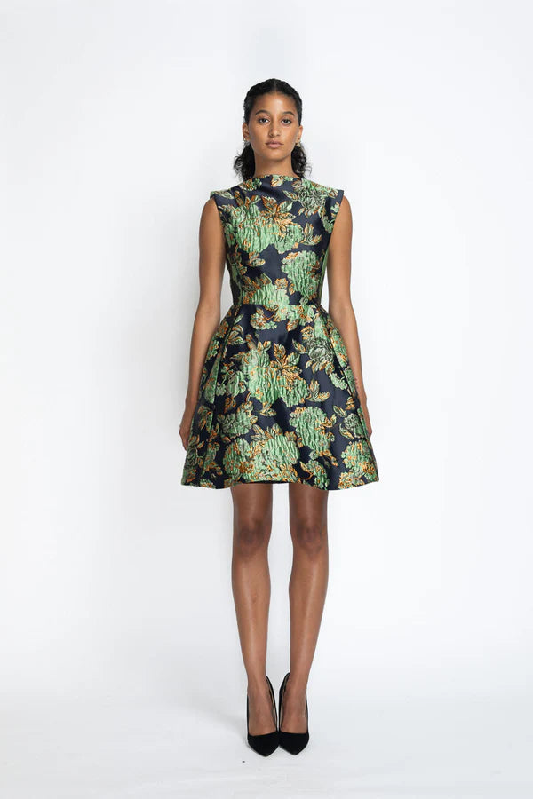 A clean boat neckline and dramatic plunge back are paired with Gilded Grove jacquard in this bell-shaped dress. The rich texture contrasts the sculpted volume, creating a silhouette that feels both regal and effortlessly bold.