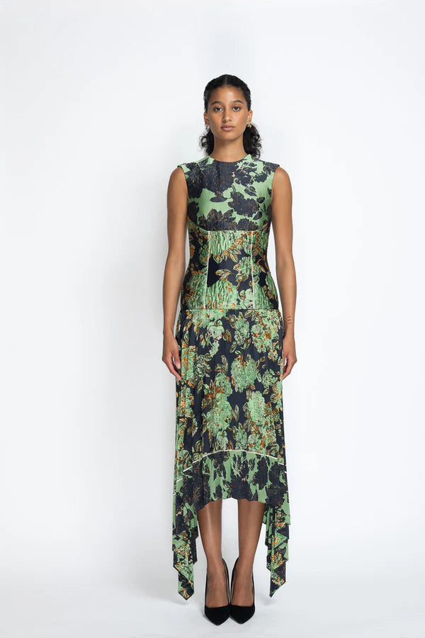 Crafted in Gilded Grove jacquard, this dress features an asymmetric pleated skirt that adds movement and visual rhythm. The rich textile grounds the sculptural silhouette, blending modern structure with ornamental ease.