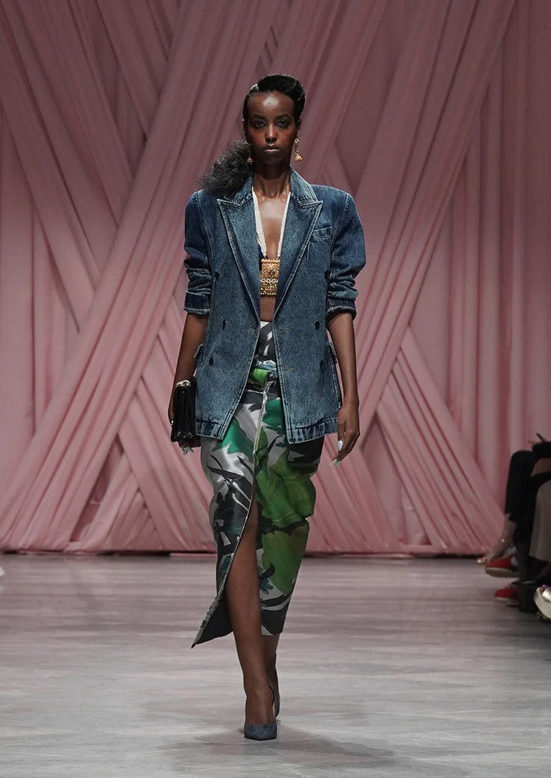 A silver Barathea pencil skirt featuring the Lata print and cargo-style pockets. Pair with the tailored denim blazer designed in a double-breasted cut with peak lapels. The structured denim contrasts with the printed skirt for a modern balance of textures.