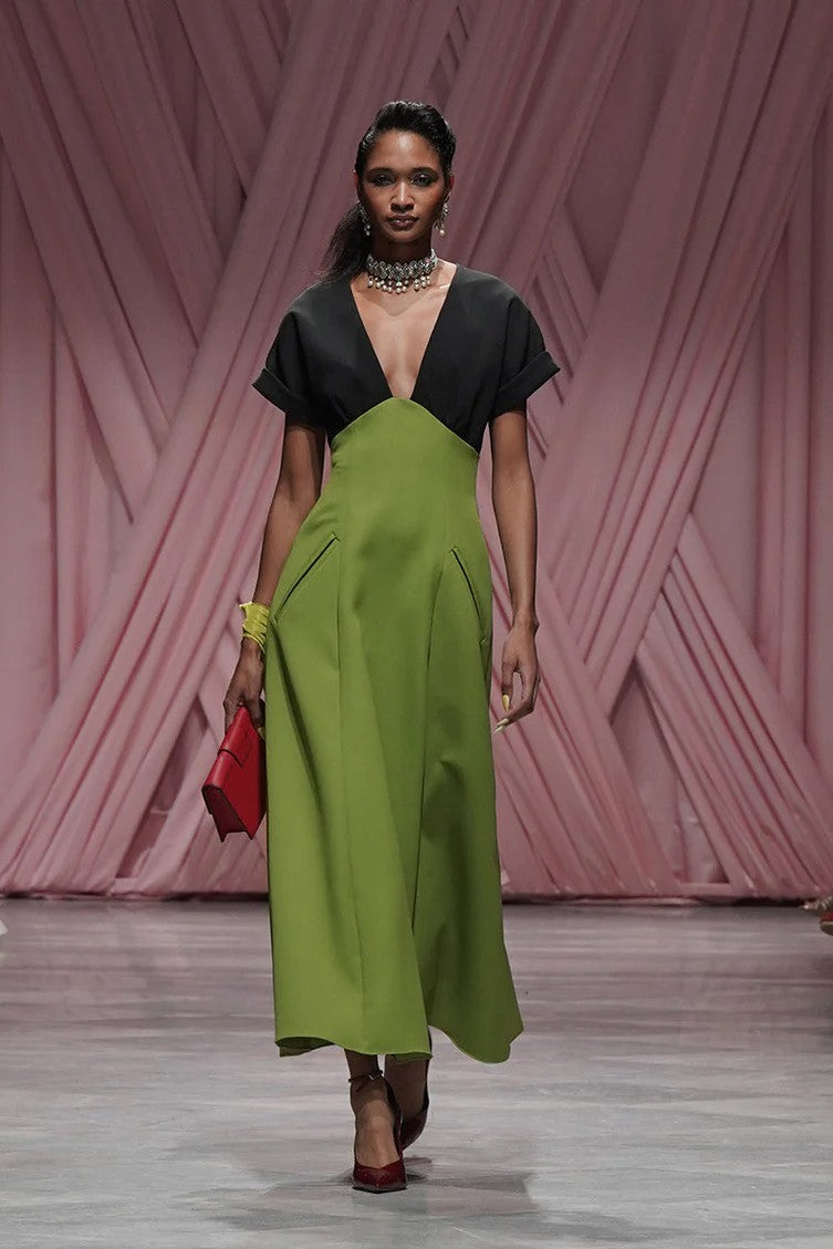 A two-tone safari dress in olive and onyx cady. Designed with flap pockets, button-front closure, and a belted waist, the silhouette is structured, yet relaxed. The contrasting colors add depth to the utilitarian-inspired design.