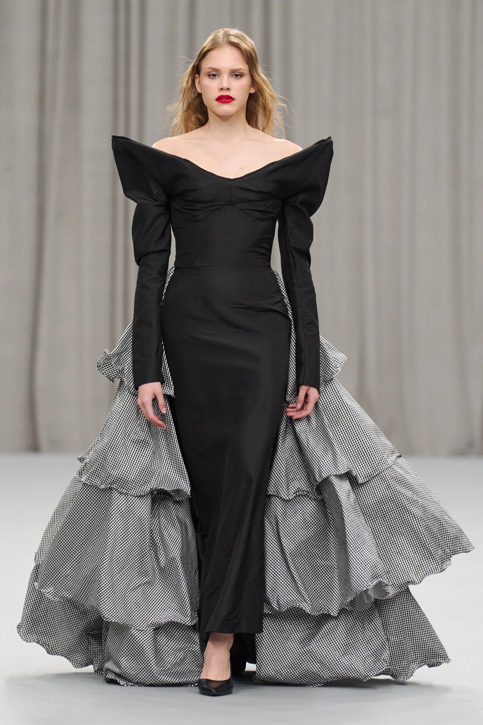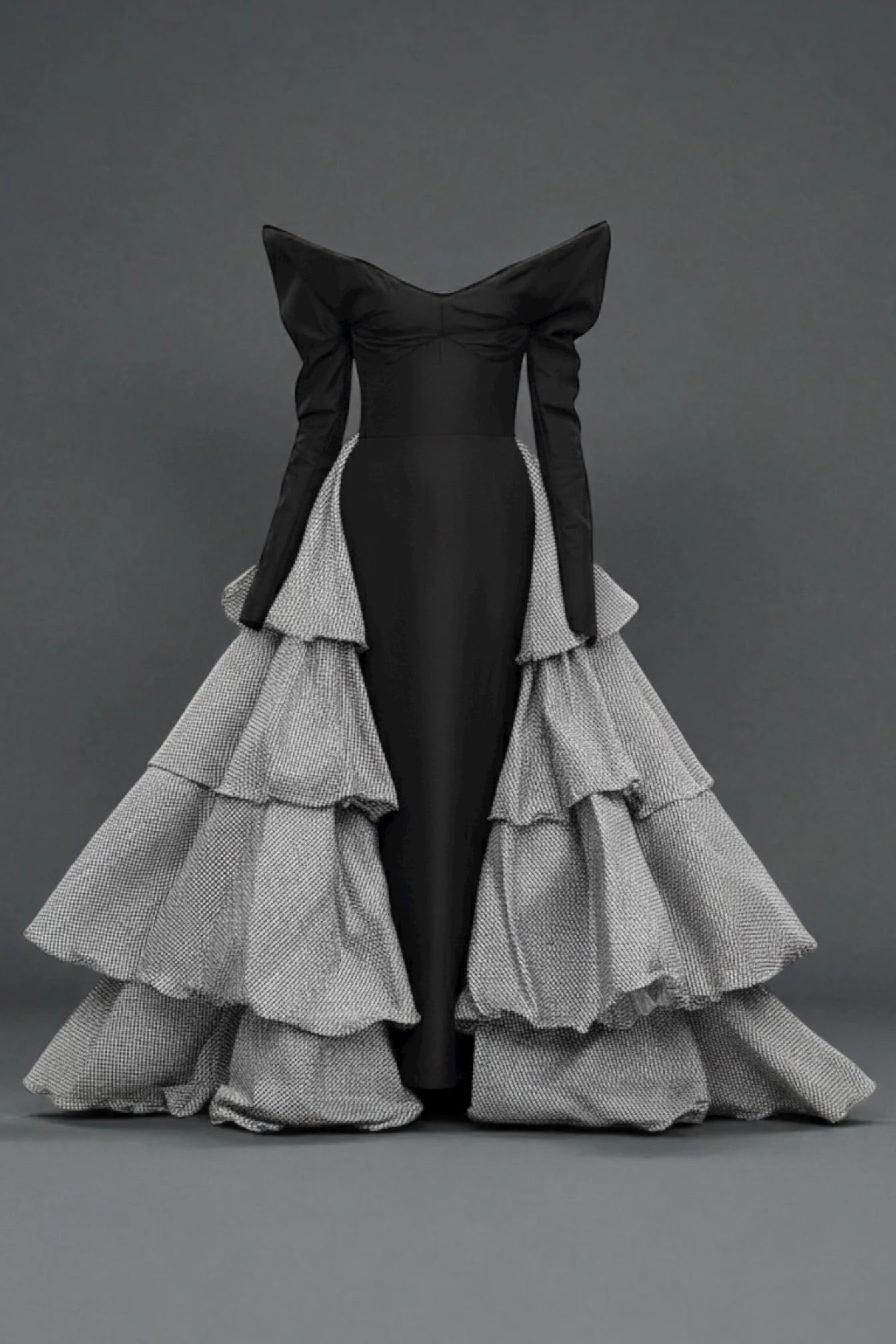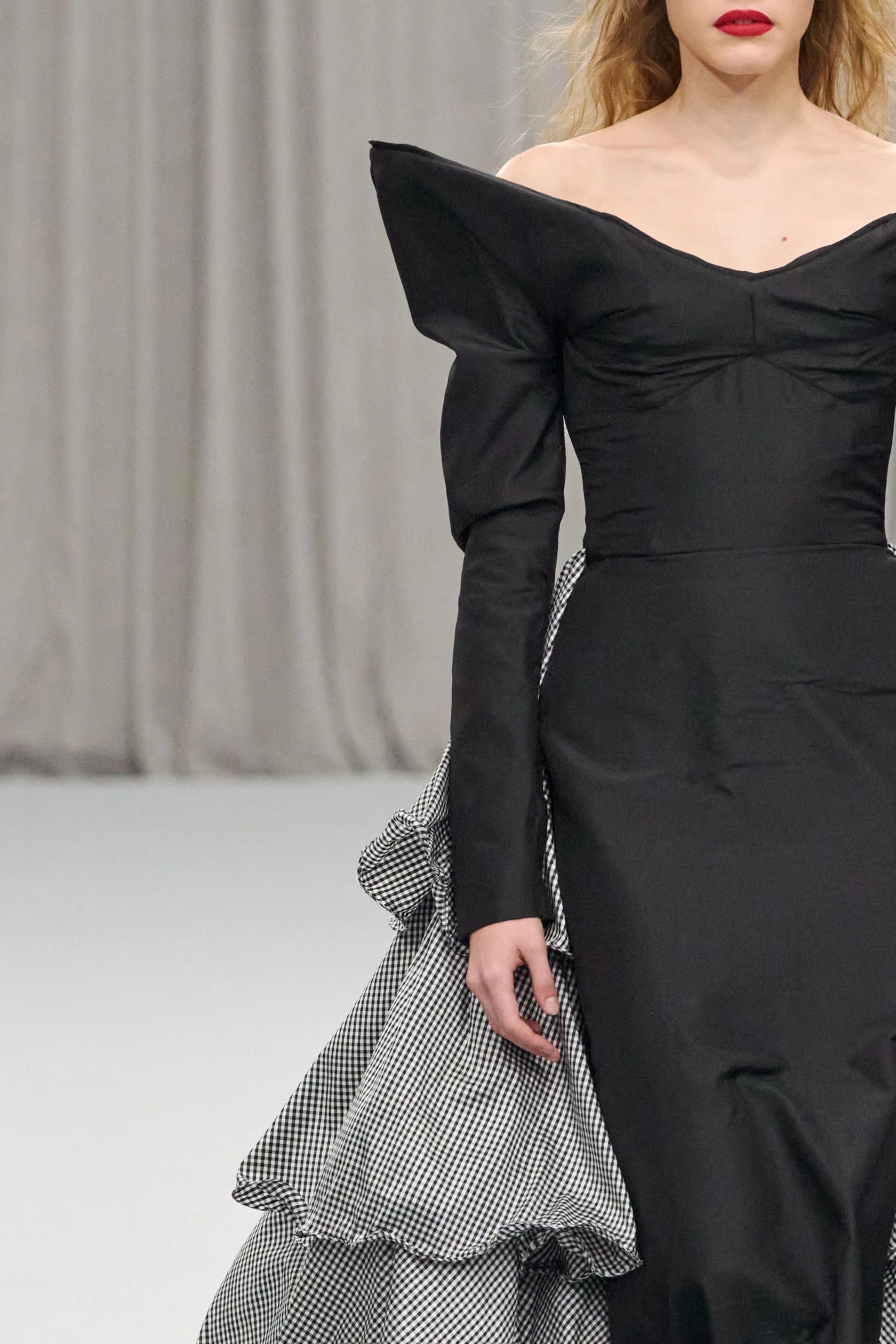 With its striking floating neckline and sculpted shoulders, Plaid Flow commands attention through bold structure. The sleek black form is offset by cascading plaid tiers, creating a dramatic interplay of rigidity and movement. A statement of power and grace, it transforms classic patterns into elevated architecture.