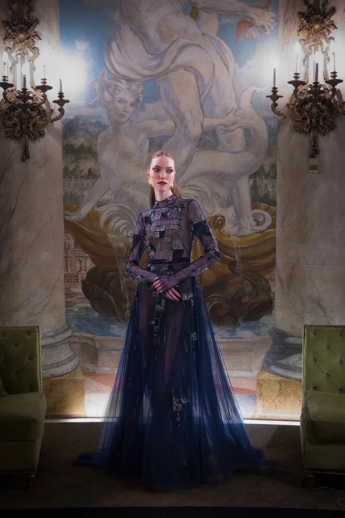 Light as air, this romantic navy tulle gown is adorned with rice plume embroidery that glimmers against delicate pleats. The skirt falls in weightless folds, creating a fluid silhouette. The graceful movement of the layered fabric is reminiscent of a sea breeze off coastal Odisha—a beautiful tribute to place and handcrafted elegance.