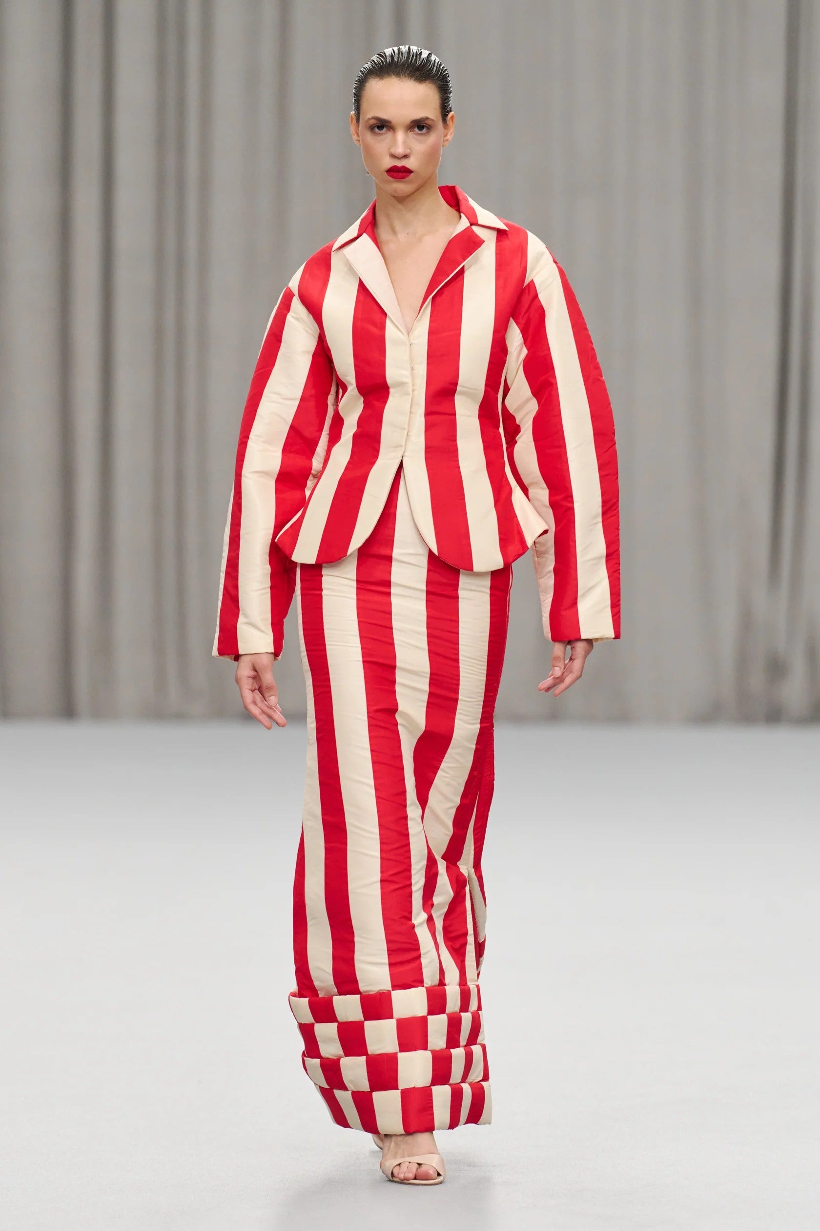 Crafted in handcrafted quilted fabric, blending tradition with modern tailoring.The bold red-and-white stripes