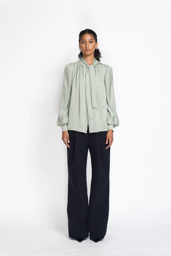 A soft pussy bow neckline and voluminous blouson sleeves are the defining features of this seafoam green crepe blouse. The fluid drape and gentle tailoring evoke understated sophistication, perfect for both layered styling and standalone elegance.