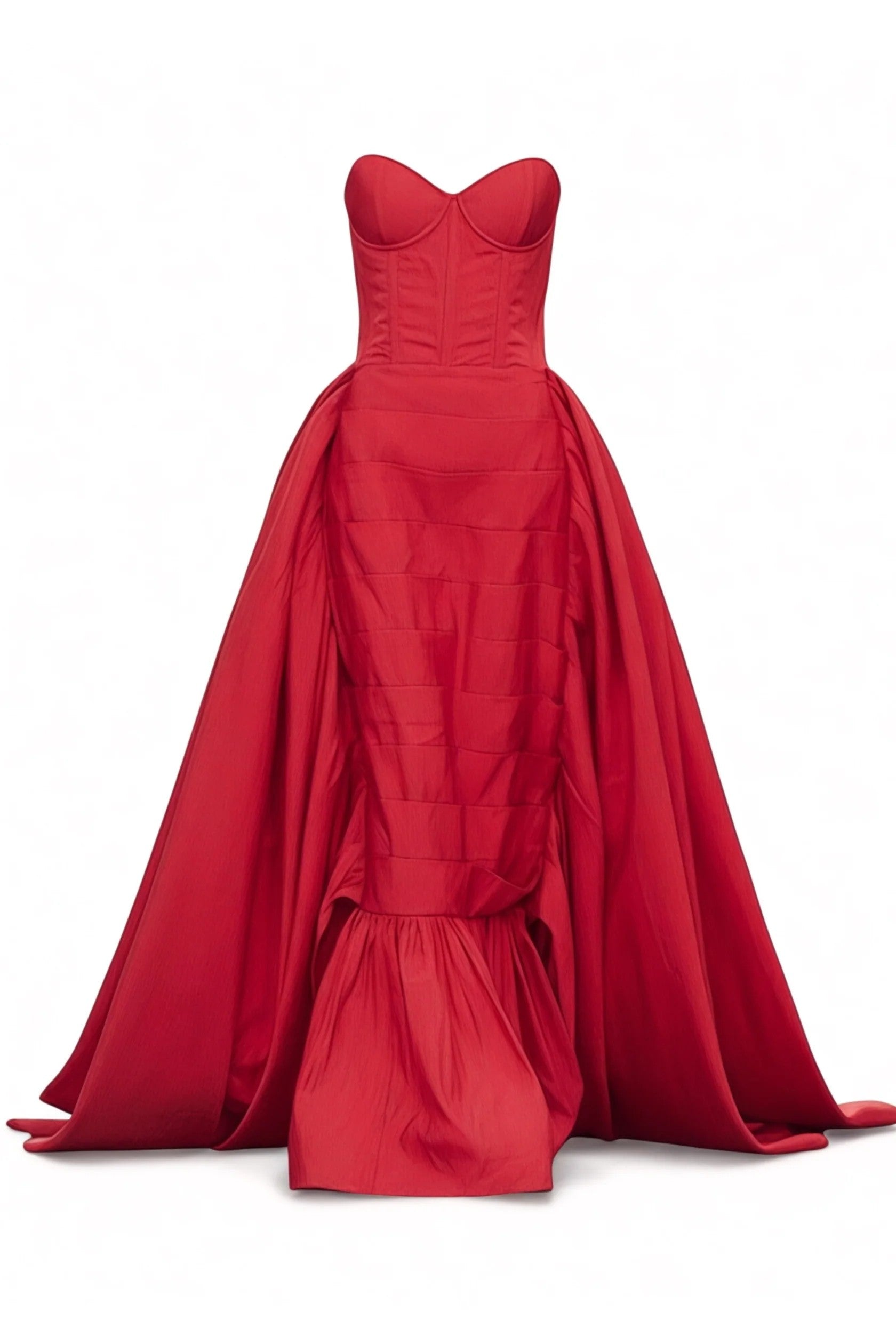 This statement piece combines classic romance with modern couture structure. It features a beautifully fitted, strapless sweetheart corset bodice that provides support and definition. The skirt is a masterpiece of design, showcasing two distinct textures: a central panel with structured ribbed ruching/horizontal pleats, framed by an immense, voluminous overskirt that cascades dramatically to the floor. The 100% Silk Ribbed Taffeta gives the gown its striking shape, lustrous finish, and slight crispness, ensuring you command attention.