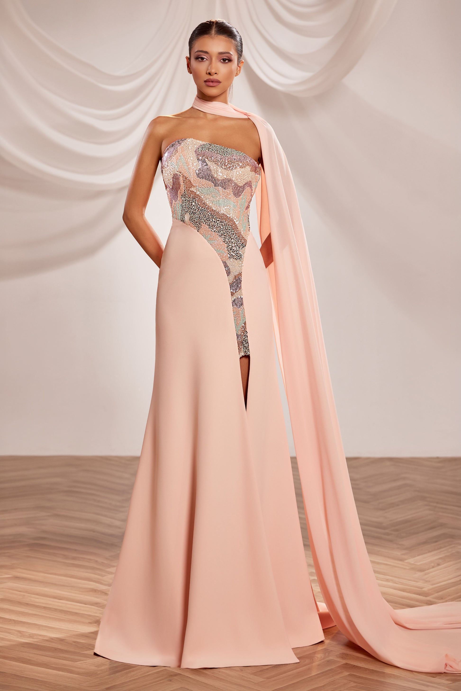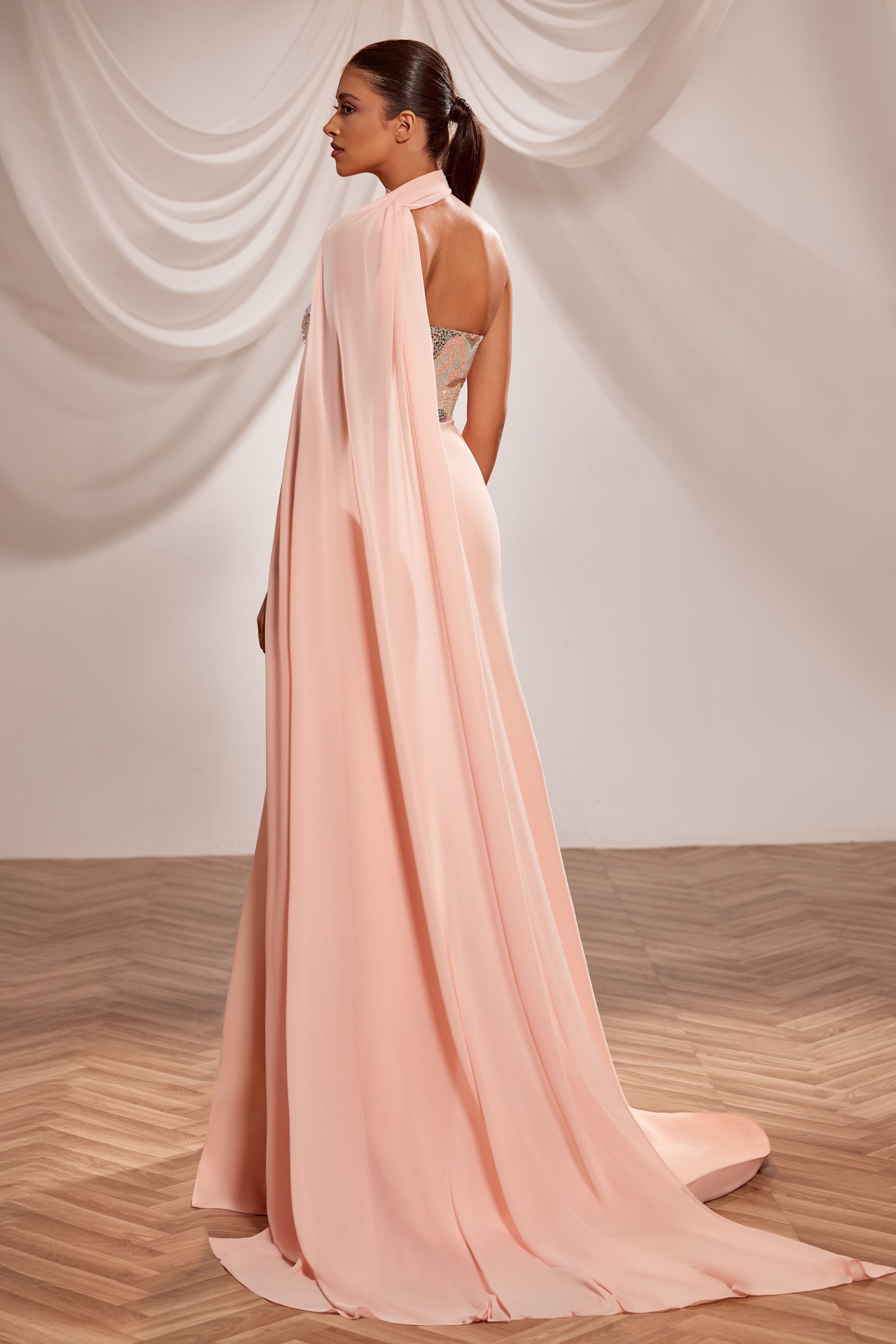 • Seamlessly Merging into a Flowing Crepe Skirt
