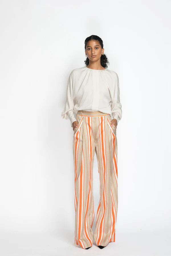 Tailored in striped twill, these front-pleat trousers combine structured polish with ease. The clean lines elongate the silhouette, while the subtle pleating introduces movement and fluidity. These twill trousers are a refined essential for elevated day dressing.