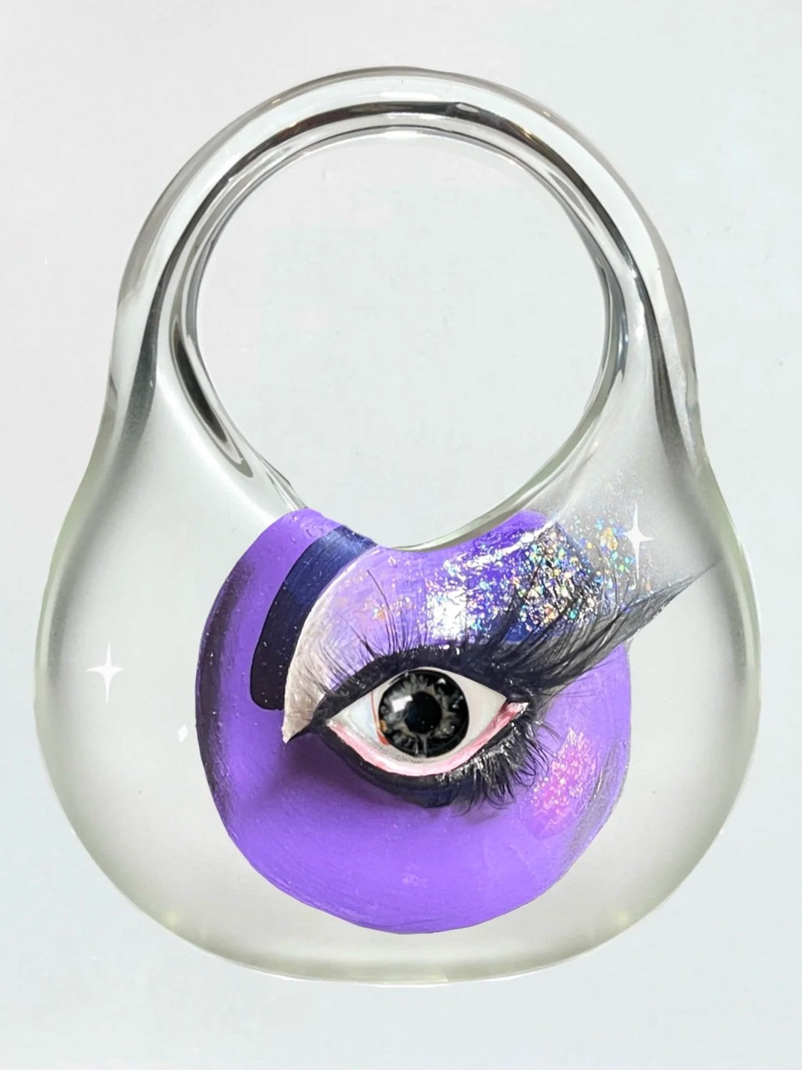 A limited-edition glass bag proudly created in collaboration with The Mother Birdie. This piece features a hand-blown glass eye with custom makeup and eyelashes applied by Birdie herself. She looks way too real! Each bag is one-of-a-kind, combining the creativity of Raiffe with Birdie’s mastery of makeup and her eye-conic style.