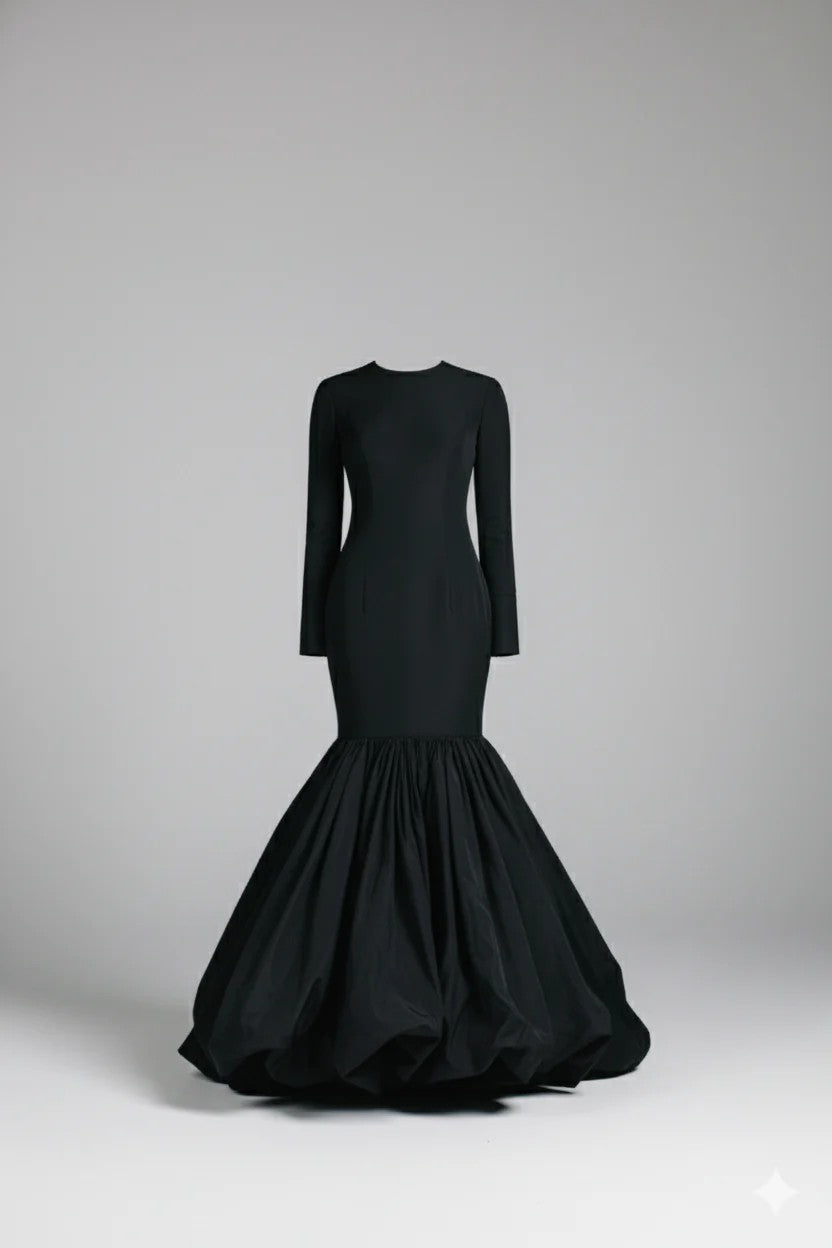 A striking embodiment of mystery and grace, this taffeta silk gown from the Nocturnal Collection exudes quiet power. The structured yet fluid silhouette features a form-fitting bodice that transitions into a voluminous gathered hem, creating a dramatic yet refined presence.